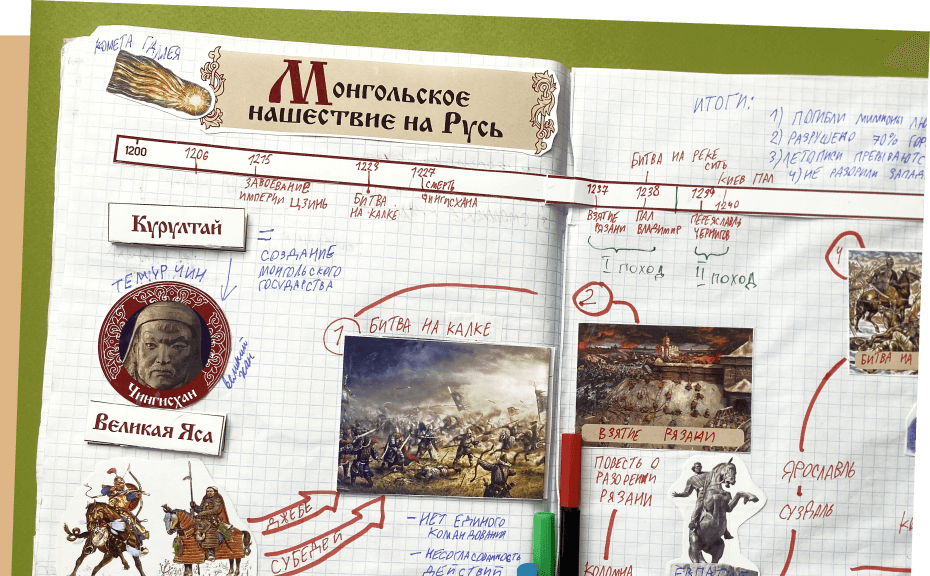 Создание большого цветного конспекта поможет ребенку с лёгкостью ориентироваться в истории: запоминать последовательность событий, узнавать предметы эпохи, представлять жизнь людей прошлого