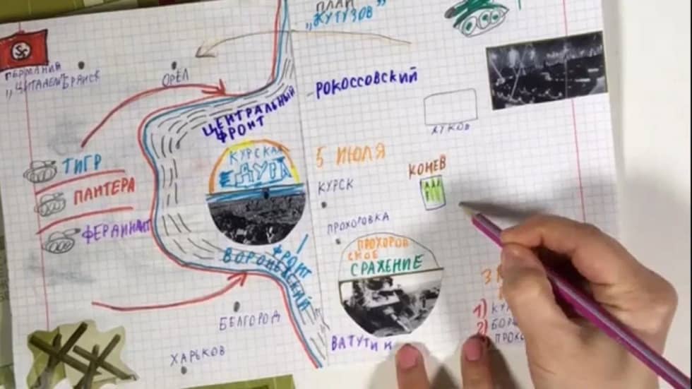 Запишем, как проходили Битва за Москву, за Севастополь, зарисуем схемы как отстояли Сталинград, как сняли осаду Ленинграда, начертим Курскую дугу и план Берлина. Поговорим о конференциях и параде 1941 года. Нарисуем медаль «За отвагу», танк т-34.